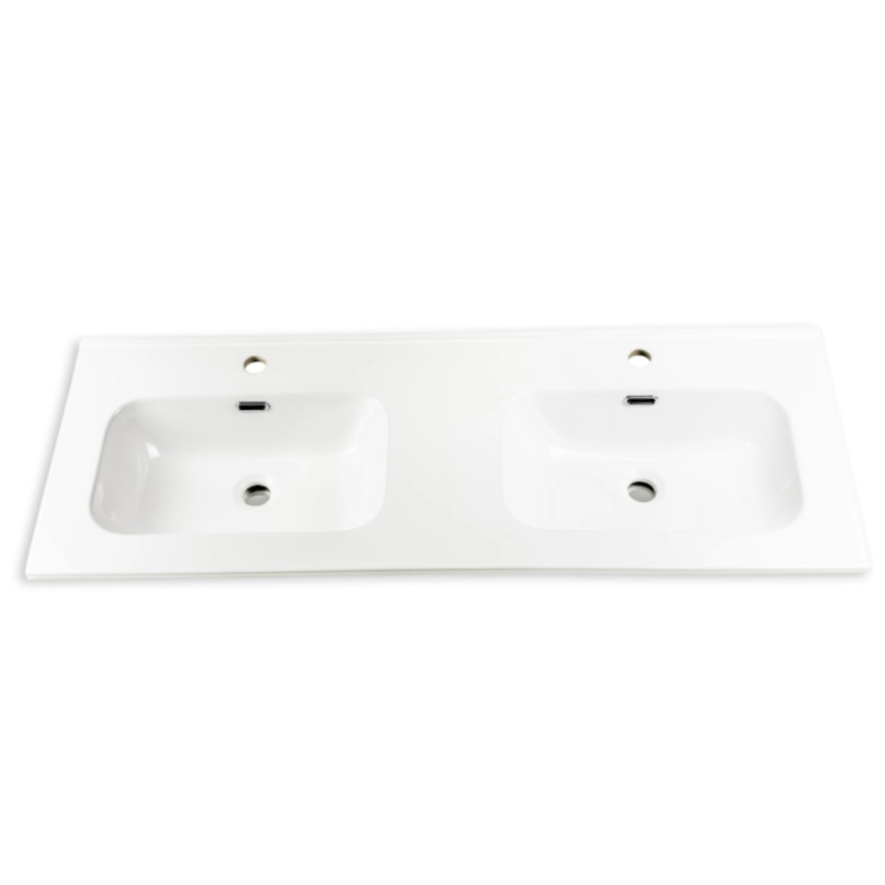 El lavabo doble, fabricado en cerámica con un espesor de 1,5 cm, incluye un seno centrado y sobresale ligeramente del mueble (1,5 cm), aportando protección y un acabado elegante. Ideal para el uso diario, su diseño está pensado para resistir la humedad y el desgaste del tiempo.