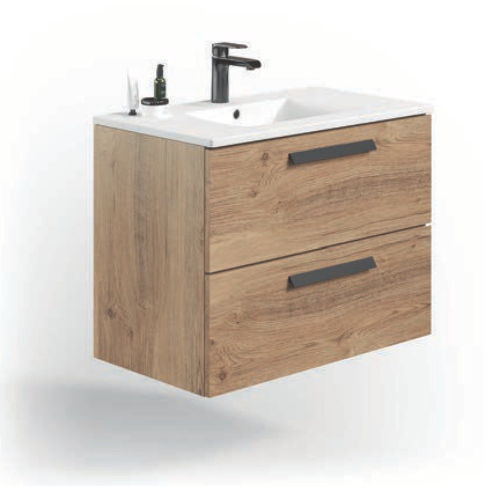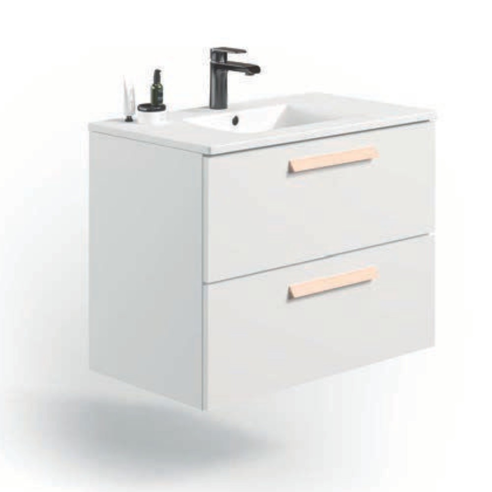 Sus dos cajones metálicos con cierre amortiguado ofrecen comodidad y orden. mientras que el lavabo cerámico extraplano con encimera saliente garantiza durabilidad.