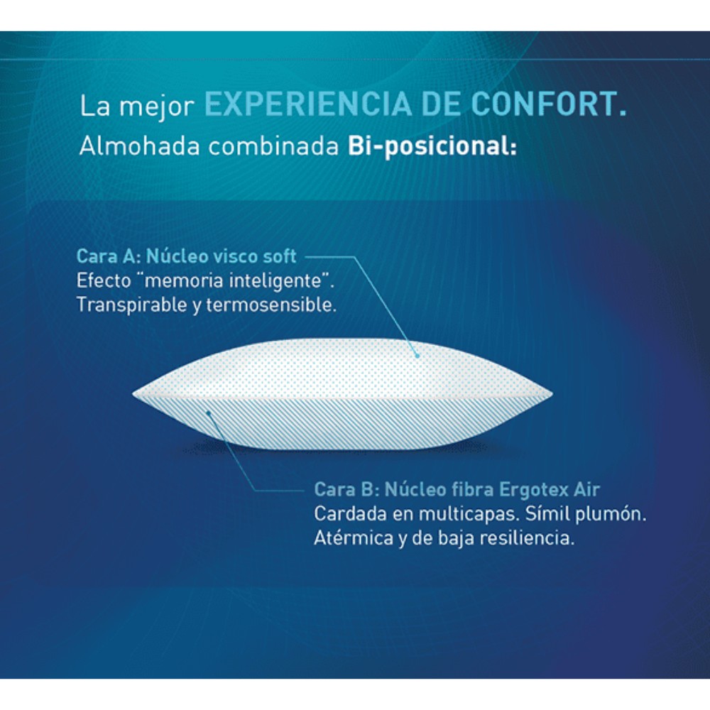 La almohada Duo Confort de Moshy está diseñada con dos núcleos independientes que permiten al usuario elegir en cada momento el soporte que prefiera: una cara viscoelástica termosensible para un apoyo adaptado, y la otra cara de fibra Ergotex Air para mayor frescura y sensación tipo plumón. Ideal para quienes quieren versatilidad durante la noche.
