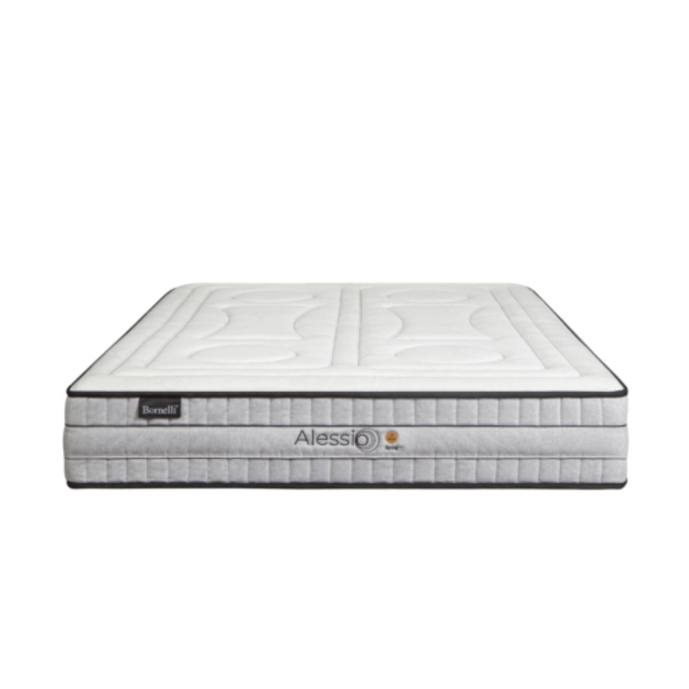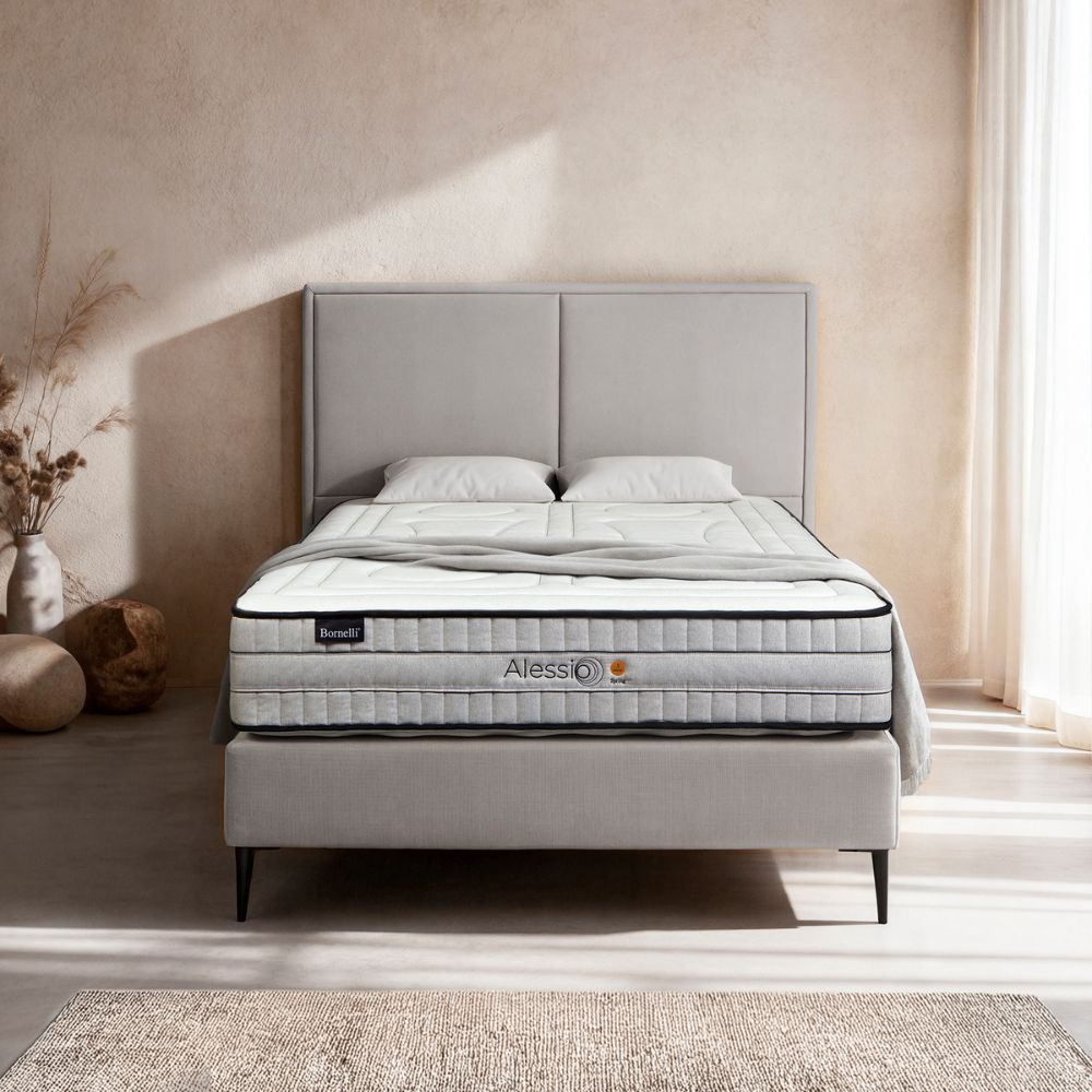 ALESSIO combina tejido Stretch de alto gramaje con carcasa SPRING SAC CONFORT 5 Zonas. Su firmeza media-alta, junto al box HR 30 kg y Visco Soft Premium, garantiza transpirabilidad y soporte duradero.