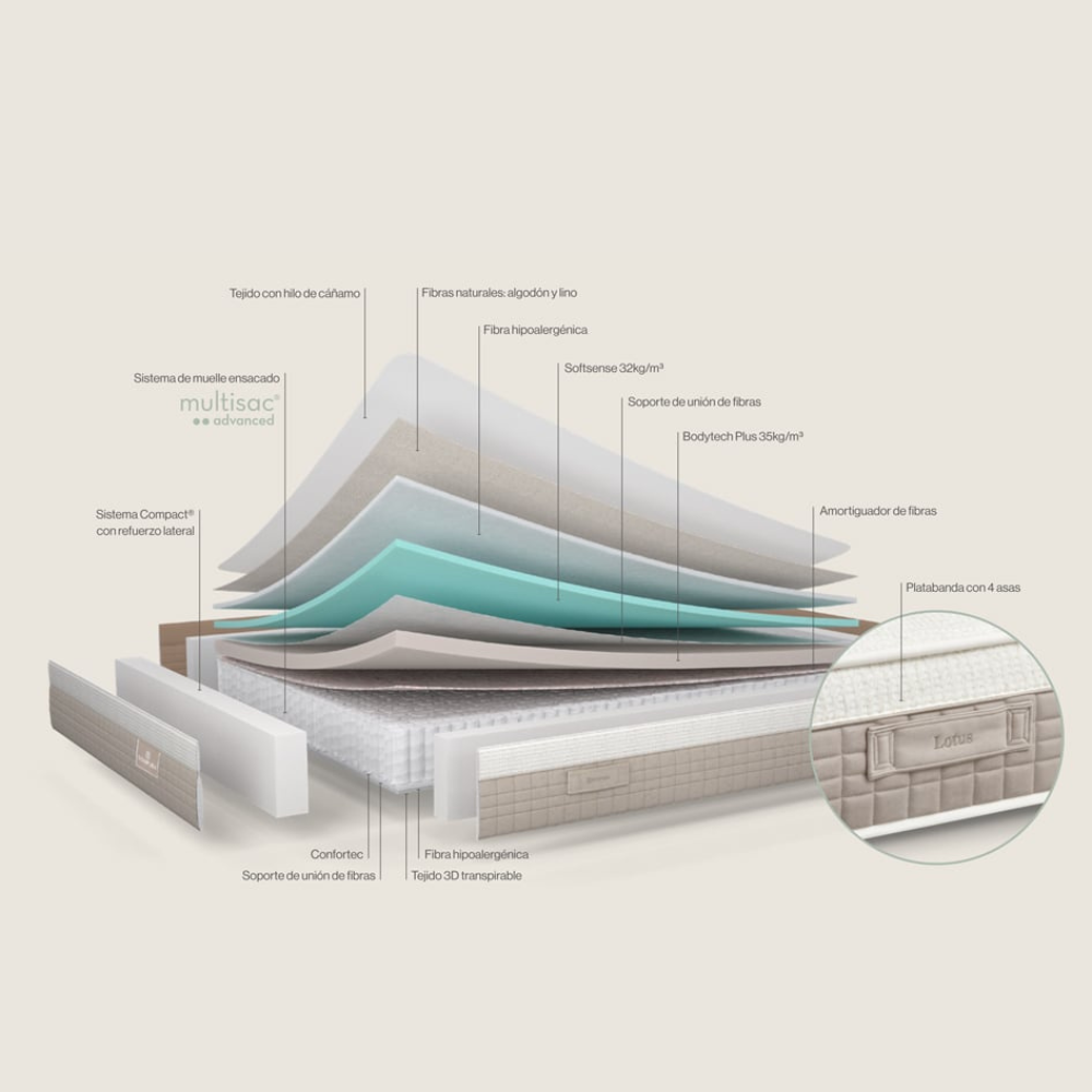 El Colchón Lotus de Sonpura combina fibras naturales de cáñamo, algodón y lino con la tecnología Multisac® Advanced de 700 muelles ensacados.