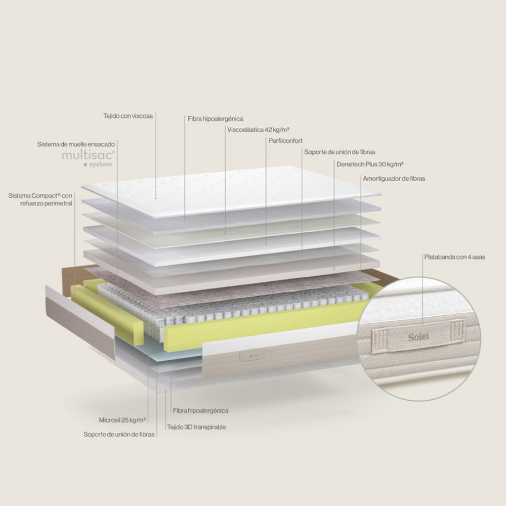 El Colchón Solei de Sonpura ofrece un descanso firme y adaptable gracias a su núcleo Multisac® System de 500 muelles combinado con viscoelástica, Perfilconfort