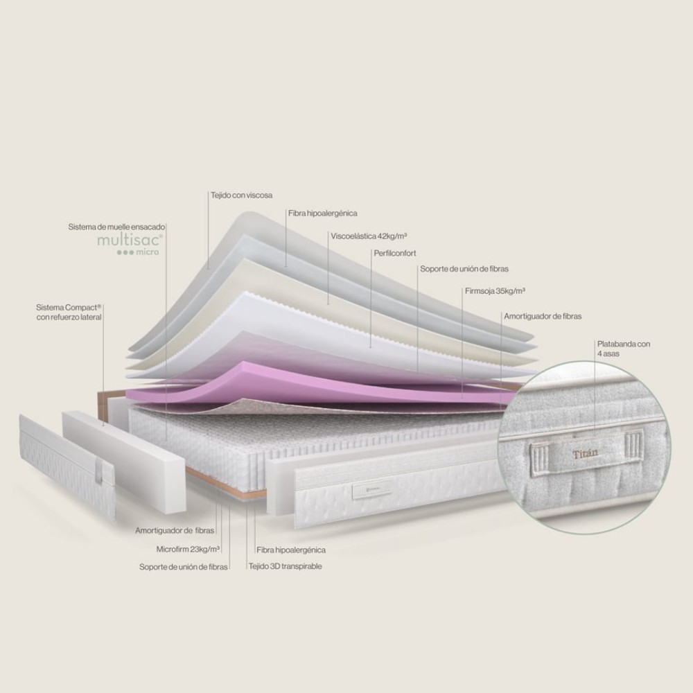 El Colchón Titán de Sonpura ofrece un descanso premium y robusto gracias a sus 1.800 muelles ensacados Multisac® Micro y su acolchado con algodón orgánico, viscoelástica y Firmsoja HR.